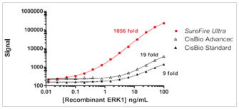 AlphaLISA SureFire Ultra 检测法 (LLOD 0.07 ng/mL) 的灵敏度明显优于标准型与增强型 Company C试剂盒(两种Company C试剂盒的LLOD均为0.63 ng/mL)。 另外,AlphaLISA SureFire Ultra p-ERK 试剂盒的信号窗口分别比高级和标准Company C HTRF p-ERK试剂盒大50 - 100 倍,即前者具有更宽的动态范围。