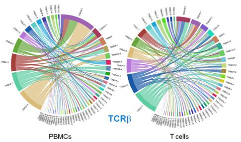图3 弦图展示两种细胞TCRβ克隆型分配情况