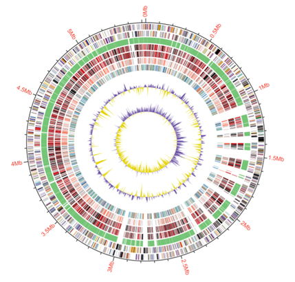2016年,天津生物芯片利用PacBio RS II平台,对GC含量高达70%的细菌进行了基因组完成图测序,仅用了1个cell测序,获得了超过1.2Gb的测序数据,实现该菌基因组200X以上测序覆盖,随后利用天津生物芯片自主研发软件进行De novo拼接,最终获得高准确性的基因组完成图。