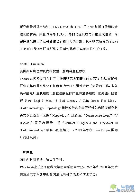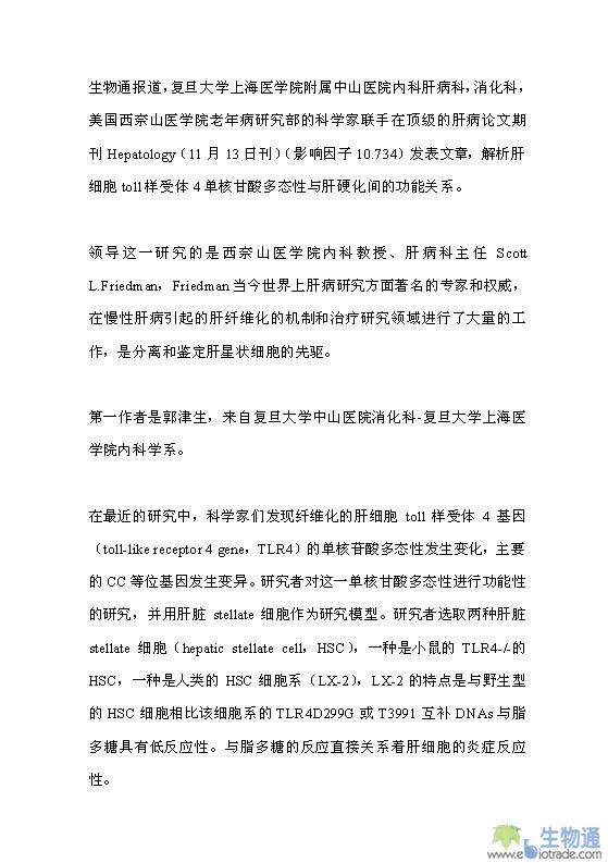 生物通报道,复旦大学上海医学院附属中山医院内科肝病科,消化科,美国西奈山医学院老年病研究部的科学家联手在顶级的肝病论文期刊Hepatology(11月13日刊)(影响因子10.734)发表文章,解析肝细胞toll样受体4单核甘酸多态性与肝硬化间的功能关系。