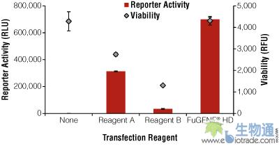 将psiCheck™-2 Vector(Cat.# C8021)瞬时转染到HEK293细胞中,由组成型的SV40启动子驱动前者表达萤光素酶。根据厂家的使用说明书,对三个不同的脂质体转染试剂(A、B与FuGENE® HD)进行优化。细胞活力(使用CellTiter-Fluor™ Viability Assay; Cat.# G6080进行检测)和报告基因活性(使用ONE-Glo™ Luciferase Assay System; Cat.# E6110进行检测)由GloMAX®-Multi Detection System Instrument(Cat.# E7031)进行检测。使每种试剂在最佳条件下使用(这种条件指的是得到的报告基因活性最高且细胞活力损失最小),从而生成数据。数据是重复样品的平均值±平均标准差。对于每个优化实验,至少检测了3种脂质体试剂与DNA的比值和2种细胞密度。