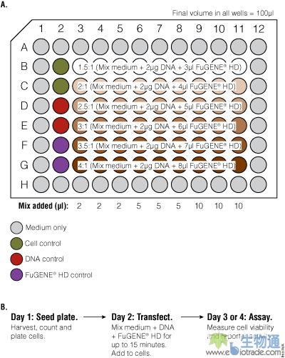 A图 使用FuGENE® HD转染试剂确定最佳转染条件的96孔板布局图。在一块96孔板中,DNA、FuGENE® HD和培养基按照图示的试剂:DNA比例制备成100µl转染混合物。在室温下孵育15分钟后,使用多道移液器将转染混合物添加到转染平板的每个孔中。平板外围的孔中仅包含100µl/孔的培养基。所有其它的孔包含100µl/孔培养有细胞的培养基。第2列:对照细胞分别加入10µl培养基、10µl DNA(培养基中含量为20ng/10µl)或10µl FuGENE® HD 试剂(来自于100µl培养基+8µl FuGENE® HD 试剂)。3-11列:按图示的转染复合物体积与图示的FuGENE® HD试剂:DNA的比例添加到细胞中。B图 优化实验示意图。第1天,平板中接种100µl的培养基或健康的细胞(从一个细胞融合度75-90%的烧瓶中收获)。第2天,将适当的对照物组合起来,将DNA:FuGENE® HD试剂转染复合物按照A图所示添加到细胞中。第3天或第4天,检测细胞活力与报告基因活性。