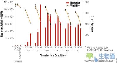 在优化实验中必须包含几个对照。未转染的细胞作为最大细胞活力和无报告基因表达的指标。仅有DNA和仅有FuGENE® HD的对照用于监测转染复合物组分对细胞的任何预料外的影响。