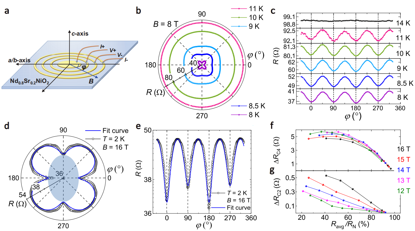 在本项研究工作中,王健课题组通过微纳加工的方法,在无限层镍氧化物超导体Nd0.8Sr0.2NiO2薄膜上制备出了环状电极结构 (Corbino-disk),系统地研究了Nd0.8Sr0.2NiO2超导薄膜的面内各向异性磁阻特性(图1a)。其中,环状的电极结构可以使得电流从中心电极均匀地流至最外圈电极,有利于揭示样品本征的各向异性特征。研究团队发现,在较小的磁场下,Nd0.8Sr0.2NiO2超导薄膜的面内磁阻R(φ)基本表现为各向同性。而随着外磁场的增加,面内磁阻R(φ)发生了从各向同性到四重旋转对称性(C-4)的转变,这一现象可能与体系的超导配对对称性从各向同性的s波配对到四重对称的d波配对有关。进一步的实验证实,面内磁阻中的四重旋转对称性(C-4)会随着超导电性在较高温度下的抑制而同时消失,表明该四重对称性(C-4)来源于Nd0.8Sr0.2NiO2薄膜中的超导电性(图1b、1c)。对面内磁阻的深入分析也很好地排除了四重对称性(C-4)来源于材料中Nd3+磁矩的可能性。