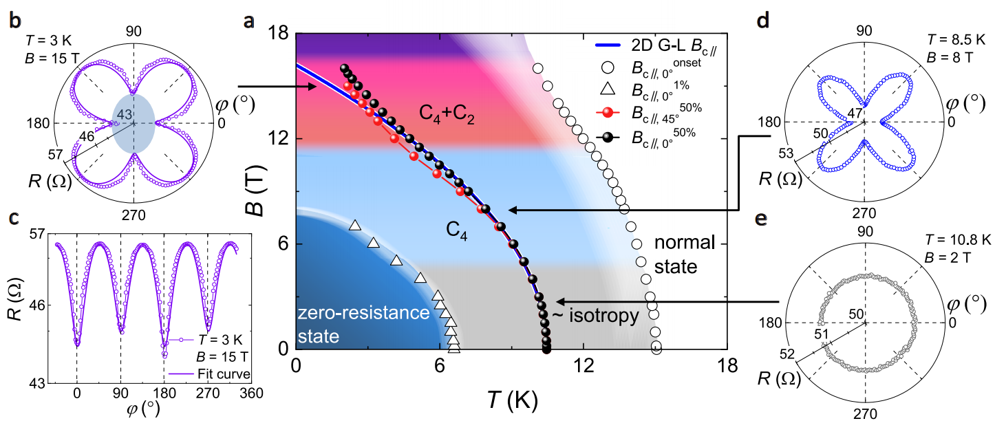 图2 (a) 磁场B与温度T的相图,全面总结了面内超导临界磁场随温度的依赖行为以及面内磁阻的各向异性特征。 (b)-(e) 部分磁场与温度下的面内磁阻测量结果。随着外加磁场的增加,R(φ)曲线表现出从各向同性(e)到C4各向异性(d)再到C4+C2各向异性(b, c)的旋转对称性破缺的转变,黑色箭头指示了其在相图中的对应区域