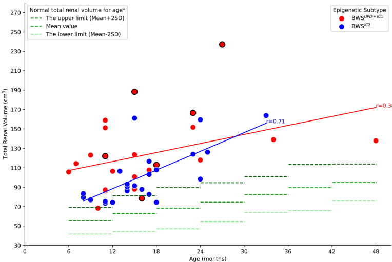 BWSUPD+IC1亚型耳凹/耳垂(16.67% vs 40%, P=0.048)和脐膨出(37.5% vs 68%, P=0.032)发生率显著低于BWSIC2亚型。值得注意的是,7例BWSUPD+IC1患者存在非肾性腹部异常(如肝血管畸形),而BWSIC2组未见类似病变。