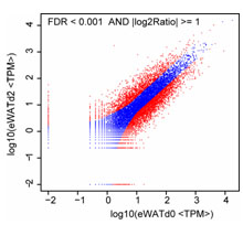 将小鼠放在寒冷环境下,在0天和2天分别取附睾白色脂肪组织样本eWATd0和eWATd2。从每种样品中提取10μg总RNA进行数字基因表达谱分析。将两种样本的数字基因表达谱结果进行对比可以筛选出和脂肪代谢相关的差异表达基因(图1)。