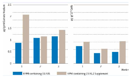 Figure 2: 杂交瘤细胞在含5%胎牛血清或1% HL-1™ 血清替代物的RPMI-1640培养基单克隆抗体生产能力的比较。细胞连续培养三周,每周传代三次。 |