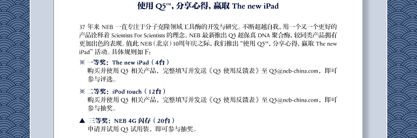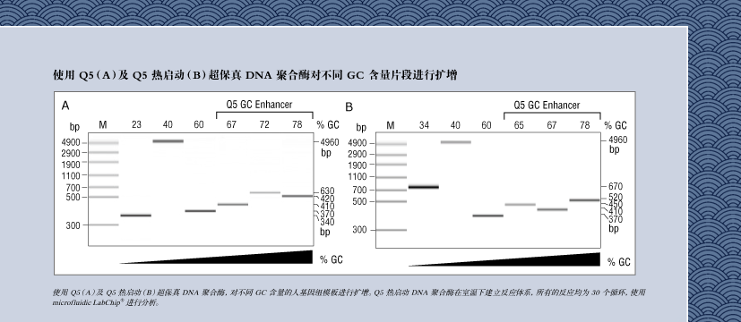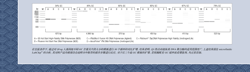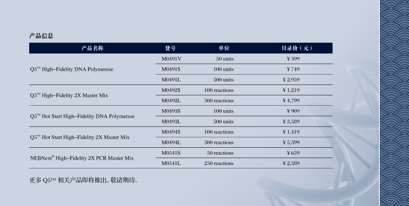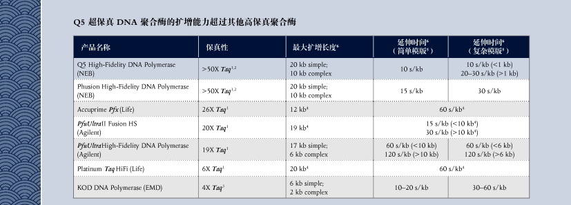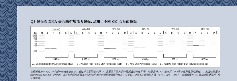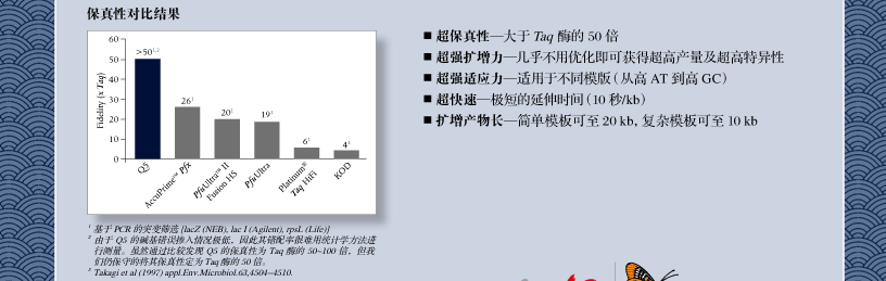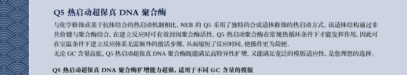 酶的 50 倍)及其超低的错配率,树立了高保真聚合酶的新标准。同时,凭借独有的缓冲液系统使扩增范围更广泛,无论模板 GC 含量的高低,Q5 超保真 DNA 聚合酶均有卓越表现。Q5 超保真 DNA 聚合酶提供包括预混液和热启动等多种方便的剂型,是超保真聚合酶的上佳之选。