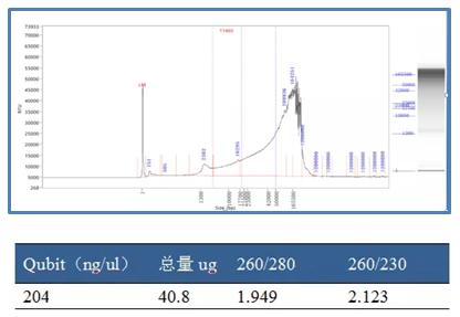 如图所示,在164251 bp检测到主峰,最长片段可达200000 bp。 A260/A280 > 1.75、 A260/A230 > 2.00,样本纯度非常高。