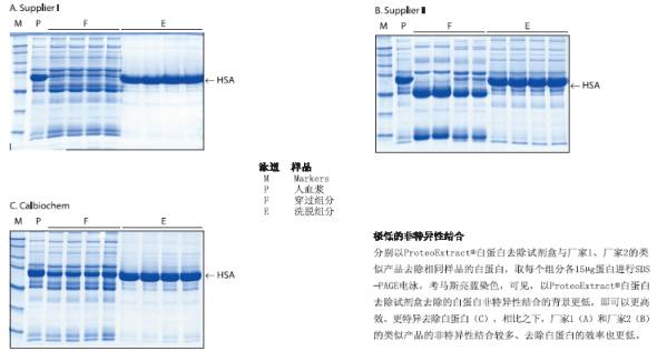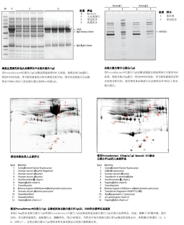 潜在疾病标志物的最好样品来源就是血清或其他体液,此类样品可以提供人蛋白质组中绝大部分组份。然而,用蛋白质组分析方法鉴定疾病标志物最大的挑战来自于血清中大量的高丰度蛋白对检测的干扰,血清中有大约55%的蛋白为白蛋白,而IgG大约占血清中蛋白总量的25%,这些高丰度蛋白的存在会增加低丰度蛋白检测的难度,去除占血清总蛋白近75%的白蛋白和IgG将有助于更好地鉴定其他的蛋白。ProteoExtract®高丰度蛋白去除试剂盒可以从体液如血浆或血清中高效、特异性地除去白蛋白、或同时除去白蛋白和IgG,从而显著降低样品的复杂性,利于低丰度蛋白的检测,因此在发现生物标志物、新药毒理学研究、SELDI蛋白分析等方面有重要意义。被除去的血清白蛋白和IgG占其总蛋白的75%,从而使得剩余的样品可以浓缩3-4倍上样,用于SDS-PAGE凝胶电泳、2D凝胶电泳或液相色谱分离。