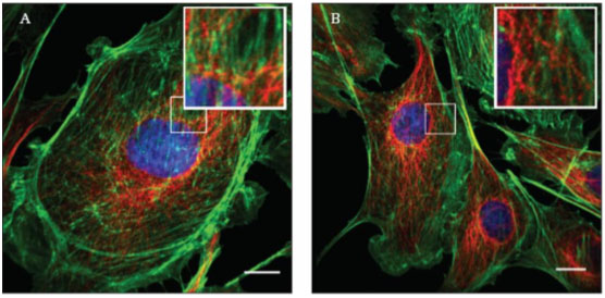 图4 用微管抗体标记的细胞,用BODIPY-FL(绿色),Texas-Red-X Phallioidin(红色)和DAPI(蓝色)修饰的二次抗体观察细胞的共聚焦切片。采用63 x,1.4 NA油浸物镜。A, UltraView ERS间行/列扫描型数码相机;B, UltraView ERS电子倍增型数码相机。插图为10μm方框的放大图,图中标尺:10μm。 |