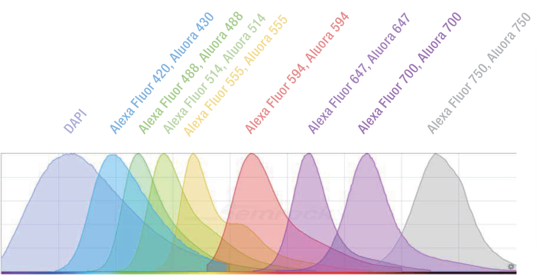 图1 光谱染料适配性。9 标组合试剂发射光谱解析案例展示,可通过EVOS S1000 机载软件同时完成光谱解析:Panel 组合包含DAPI、Invitrogen™ Alexa Fluor™ 染料和Invitrogen™ Aluora™ 染料