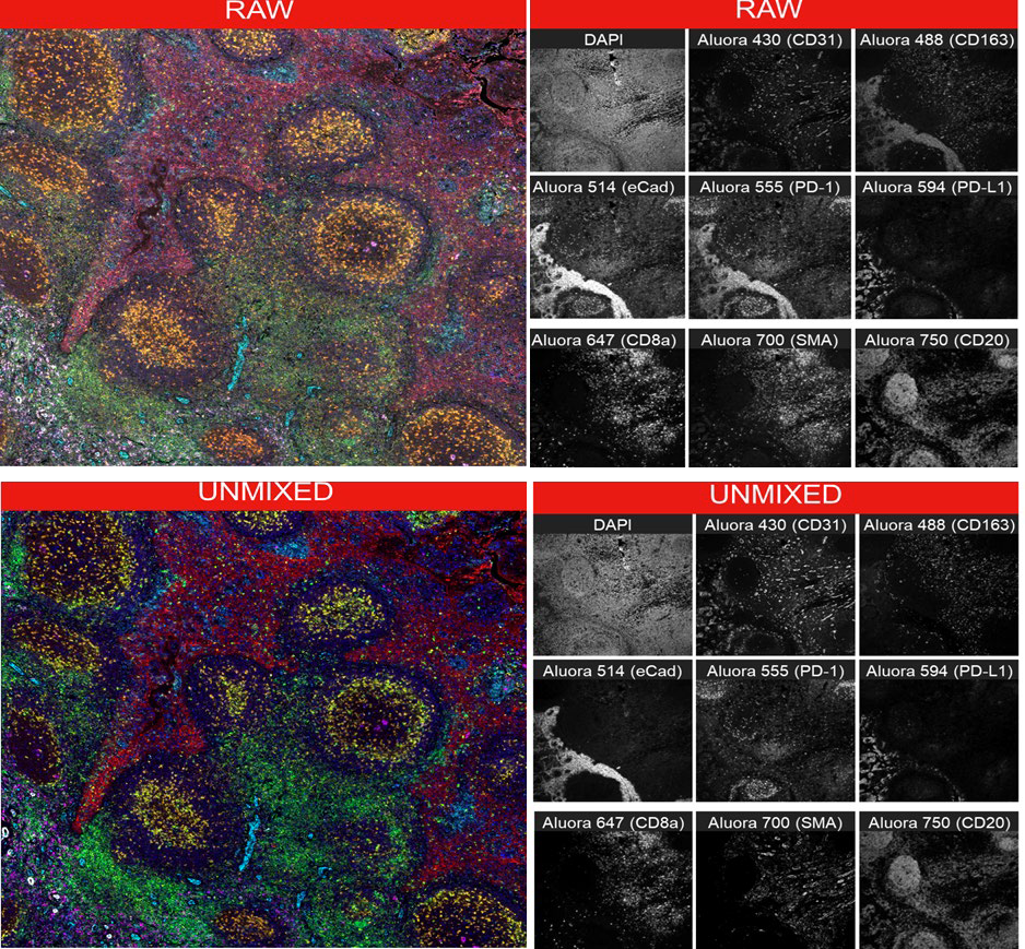 下图展示的为人扁桃体的原始图像和光谱解析后的图像。由于发射光谱的重叠,Aluora 488、Aluora 514 和 Aluora 555 以及 Aluora 647 和 Aluora 700 捕获通道中结构的染色相似。使用 EVOS S1000 空间成像软件对该图像进行自动光谱解析,使每个通道染料特异性的标记。最终的复合图像更加清晰,并且更便于定量成像应用。