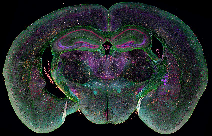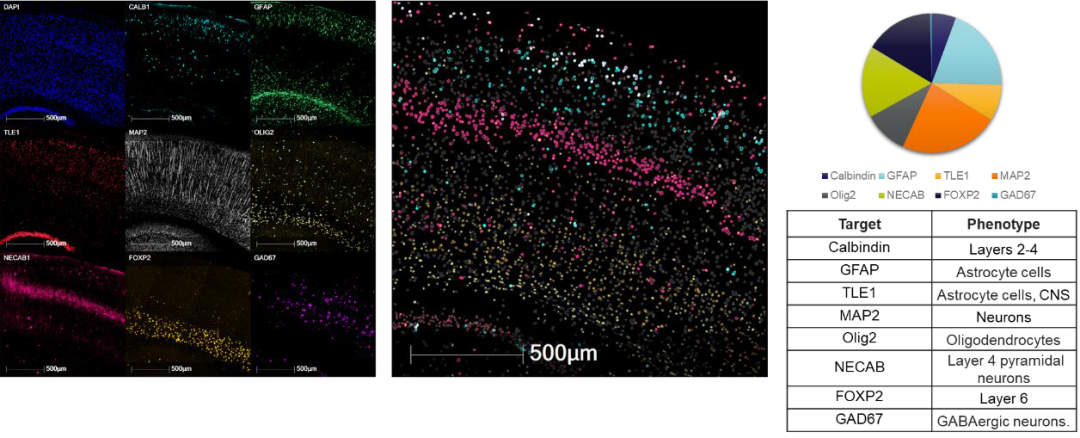 EVOS S1000也可以用于神经元细胞的空间组学研究。使用EVOS S1000对正常小鼠脑组织进行分析,以识别单细胞靶标表达和神经元细胞亚群的特定定位。这里分析了3.5 mm²区域内的4763个细胞,识别了特定区域的细胞定位。
