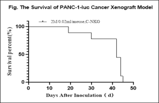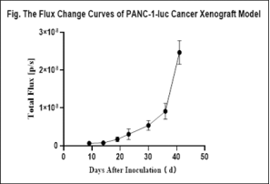 图23. 利用C-NKG小鼠建立胰腺原位模型。将人胰腺癌细胞系PANC-1移植到C-NKG小鼠体内后检测其荧光效应、小鼠生存情况以及总荧光值的平均值。结果显示,PANC-1胰腺原位模型成功建立。