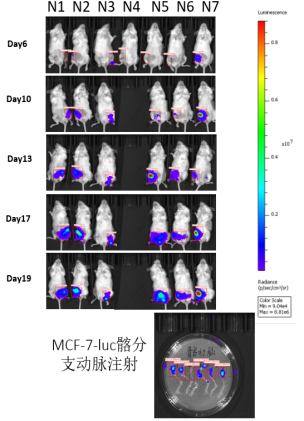 图25. 利用C-NKG小鼠建立乳腺癌骨转移小鼠模型。将人乳腺癌MCF-7-luc细胞以胫骨注射的形式接种到C-NKG(左),细胞接种量为0.5×106/只,同时,以髂分动脉注射的形式接种人乳腺癌MCF-7-luc细胞到C-NKG,细胞接种量为1×106/只(右)。结果显示,MCF-7-luc在C-NKG小鼠上均能有效地建立骨转移肿瘤模型。
