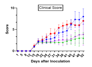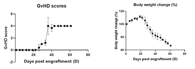 图6. 人源PBMC移植C-NKG小鼠后GvHD评分及小鼠体重变化。人源PBMC移植至C-NKG小鼠后,在28天左右开始出现GvHD现象,小鼠体重明显下降,45天后体重降低超过20%。