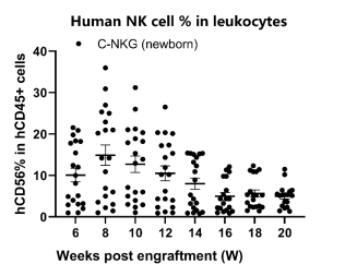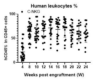 图11. 移植人源HSC后C-NKG成体小鼠外周血中人源CD45+白细胞(leukocytes)的含量变化。移植人源HSC后C-NKG成体小鼠外周血中人源白细胞的含量逐渐增加,重建稳定后人源CD45+白细胞的平均比例可达60%以上。