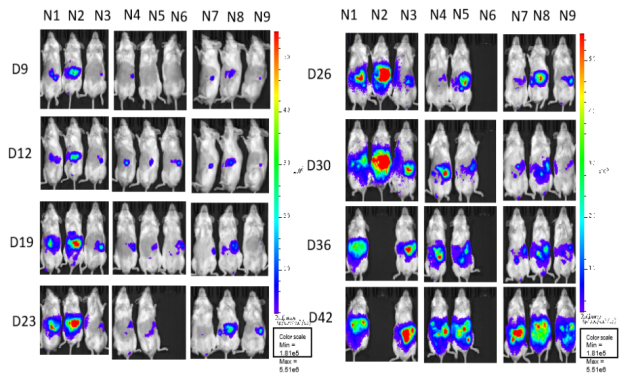 图21. C-NKG小鼠移植人Jurkat细胞后肿瘤的生长情况。将带荧光素酶标记的人T淋巴细胞瘤细胞系Jurkat通过尾静脉注射移植到C-NKG小鼠体内,后续通过荧光发生检测肿瘤的生长情况,结果显示Jurkat淋巴细胞瘤细胞可在C-NKG小鼠体内生长,表明该肿瘤模型的成功建立。