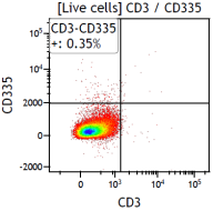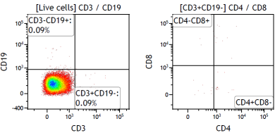 图2. C-NKG小鼠脾脏组织中的B、T、NK细胞严重缺失,表现为重度免疫缺陷。取C-NKG小鼠的脾脏组织,对其T、B和NK细胞的组成进行代表性流式细胞免疫表型分析及统计对比。检测结果显示C-NKG小鼠脾脏组织中的B细胞(CD3-CD19+)、T细胞(CD3+CD19-)、辅助性T细胞(CD3+CD4+CD8-)、细胞毒性T细胞(CD3+CD4-CD8+)、NK细胞(CD335+CD3-)几乎完全缺失。