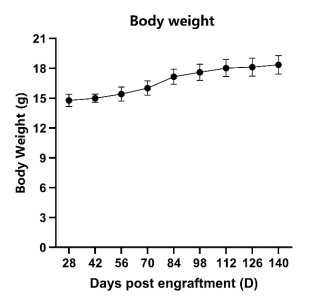 图10. huHSC-C-NKG成体移植鼠生长曲线。huHSC-C-NKG成体移植鼠在移植人源HSC后能维持正常的生长。