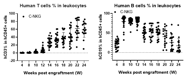 图12. 移植人源HSC后C-NKG成体小鼠人源T细胞和B细胞的重建效果。该模型早期的免疫系统重建以B细胞为主,后期B细胞比例逐渐下降,T细胞比例逐渐上升。在人源HSC移植12周开始,C-NKG小鼠体内T细胞比例开始增加,在16周时就可达40%左右;B细胞的比例在移植初期较高,可达80%,随着移植的时间增加,B细胞的比例不断下降,在第24周时降至15%左右。