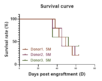 图3. huPBMC-C-NKG小鼠生存曲线。在移植后35天左右,huPBMC-C-NKG小鼠随着移植物抗宿主病(GvHD)的出现而逐渐开始死亡,移植60天后仍有约20%小鼠存活。