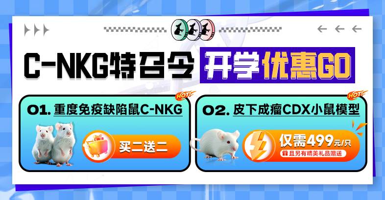 C-NKG小鼠是赛业生物在NOD-Scid背景品系上敲除Il2rg基因自主研发的一种重度免疫缺陷小鼠。C-NKG小鼠缺乏成熟的T、B、NK免疫细胞,补体活性降低,巨噬细胞对人源细胞吞噬作用弱,可高效地移植人造血干细胞(HSC)、外周血单核细胞(PBMC),患者来源的异种移植物(PDX)或成体干细胞和组织,是目前公认的免疫缺陷程度高且可用于肿瘤、免疫、自身免疫性疾病、免疫治疗疫苗、GvHD/移植、安全性评估等研究的优秀模型。