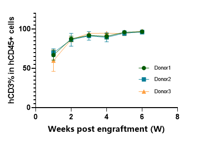 图5. 移植人源PBMC后C-NKG小鼠外周血中人源CD3+T细胞的含量变化。在人源PBMC移植3周后,C-NKG小鼠体内约95%-100%的hCD45+细胞为hCD3+T细胞,表明huPBMC-C-NKG小鼠人源免疫系统重建以T细胞为主。