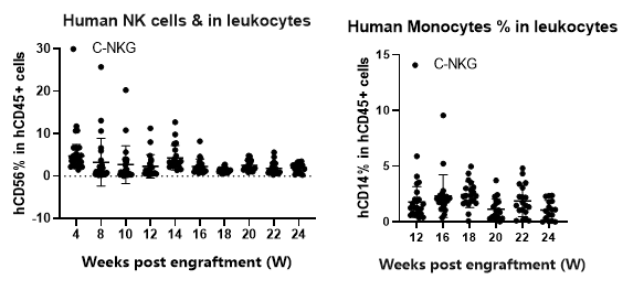 图18. 移植人源HSC后C-NKG新生小鼠中人源NK细胞和单核细胞的重建效果。该新生小鼠重建模型中NK细胞和单核细胞的重建比例较成体鼠模型高,NK细胞的平均重建比例在早期可达10%以上,后期维持在5%左右,单核细胞的平均重建比例也高于5%,因此新生鼠重建模型更适合于与髓系细胞靶点相关的研究。
