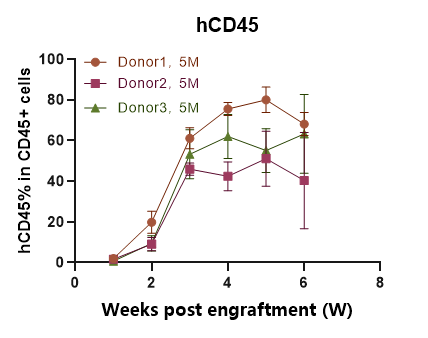 图4. 移植人源PBMC后C-NKG小鼠外周血中人源CD45+细胞的含量变化。移植人源PBMC后C-NKG小鼠外周血中人源白细胞的含量逐渐增加,3周后人源CD45+细胞的比例均值超过40%,重建速度较快(同类产品一般4周才可达到同等水平人源化比例),在移植后3-6周人源化比例持续处于较高水平。