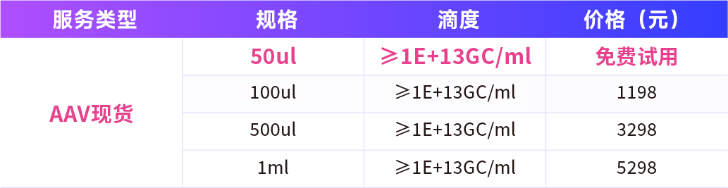 - 提供高纯度、高滴度、高活性的AAV病毒,组织特异性启动子及血清型种类丰富