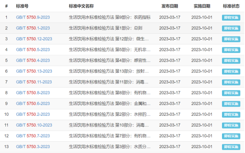《生活饮用水检验方法》(GB/T 5750-2006)修订进展一直引起大家关注。2023年3月17日,国家市场监督管理总局(国家标准化管理委员会)批准发布GB/T 5750-2023《生活饮用水标准检验方法》系列标准,自2023年10月1日起实施。