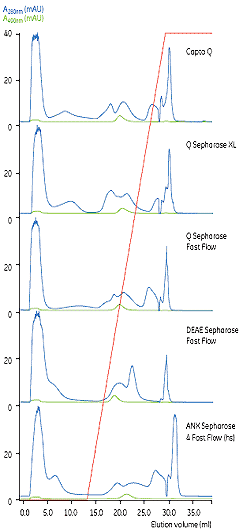 图2. E. Coli 中表达的GFP与不同介质的选择性和分离能力的比较。根据280 和490 的UV曲线综合分析,Capto Q的选择性最优。 |