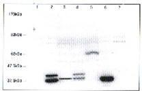 泳道1:293T细胞裂解液;2:hrGFP;3:hrGFP-Nuc;4:hrGFP-Mito;5:hrGFP II- BID融合;6:hrGFPII, 7:EGFP. |