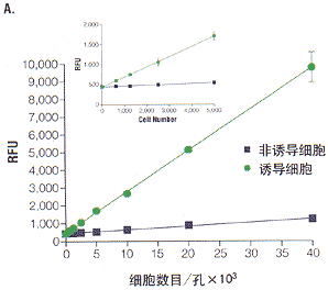 图1. Apo-ONE物质Caspase-3/7检测方法的灵敏度。我们在RPMI 1640中将Jurkat细胞培养到5.0×105细胞/m1的密度。为了诱导细胞凋亡,我们用溶解在DMSO中的抗人Fas抗体100ng/ml,处理细胞,使用96孔板,培养在含5%