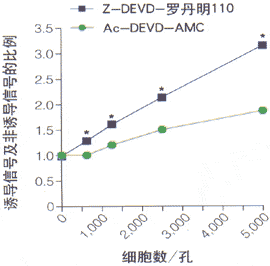 | 图2. 用Z-DEVD-罗丹明110底物能获得更高的灵敏度。按图1所描述的培养Jurkat细胞,并用100ng/ml的人抗Fas抗体培养5小时,诱导细胞凋亡,然后加入均质Caspase-3/7缓冲液及50μM Z-DEVD-罗丹明110或50μM Ac-DEVD-AMC。在室温保温平板1小时,然后用Cytofluor®Ⅱ(r)荧光平板读数仪测定荧光(*,用学生t试验表明诱导和非诱导细胞存在明显差别, P<0.01。) |