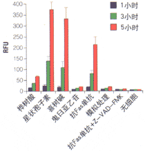 CO2中保温5小时后,我们加入均质Caspase-3/7,并在不同时间点,在Fluoro Skan平板读数仪上测定荧光。 |