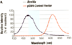 A. 测定用pCBR-对照质粒(Cat.# E1421)稳定转染的CHO细胞裂解物中纯化的海肾萤光素酶及红色Chroma-Luc™萤光素酶的光谱。用设定了收集发射光的扫描分光光度计捕获光谱。阴影区域代表所使用的两个滤光片:一个为510/60nm滤光片, 一个为610nm以上滤光片的最大重叠区域。B.监测HEK 293细胞中6小时内的海肾萤光素酶及红色Chroma-Luc™萤光素酶。用两个载体对96孔板中的细胞进行瞬时转染。两个载体包括:i)在CRE启动子调控下的