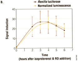 带有PEST及CL1去稳定序列的海肾萤光素酶基因,及ii)含有受SV40启动子控制的Chroma-Luc™萤光素酶的pCBR-对照载体(Cat.# E1421)。转染后大约24小时,将细胞暴露于60μM EnduRen™底物及2mM甲壳虫萤光素。2小时后,用1μM异丙醇及100μM RO-20-1742(Calbiochem, La Jolla, CA)处理细胞。在6小时内用Turner BioSystems Veritas™微孔板萤光发光计(Cat.# E6501)测定萤光。对于每一次测定,使用蓝色滤光片(510/60)测定海肾萤光,用红色滤光片(610以上)测定Chroma-Luc萤光。计算每种发光的总信号(使用www.promega.com/techserv/tool/的spredsheet 工具,选择“Chroma-Luc Calculate”)然后用经过诱导的发光平均值除以未经过诱导的发光(经红色化学发光校正或未经校正)平均值计算诱导率。对于每一个数据点,n=12并标出标准差。