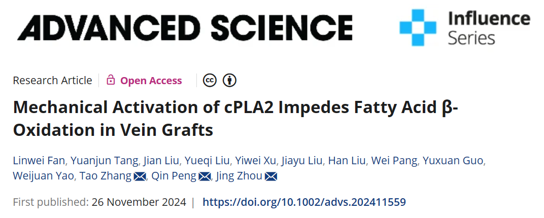 2024年11月26日,北京大学基础医学院生理学与病理生理学系周菁课题组、深圳湾实验室彭琴课题组、北京大学人民医张韬等合作在Advanced Science杂志在线发表了题为Mechanical Activation of cPLA2 Impedes Fatty Acid β-Oxidation in Vein Grafts的研究论文