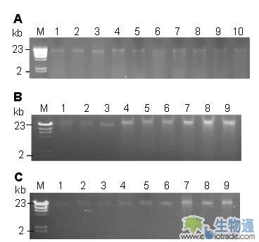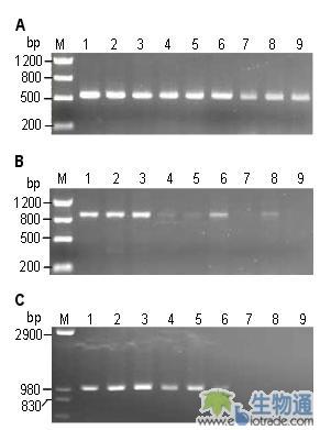 注:A,B,C分别为用引物PR1,PR2,和PA进行PCR。在所有反应(20μl)含有1U Taq酶和1μl基因组DNA;泳道1~3,4~6,7~9分别为以4~6mg,12~15mg,和25~30mg叶片在200μl TE中制备的基因组DNA。