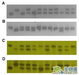注:A~D分别为用引物L14-121,J04-91,P24-83,和P24-93的PCR。左边起第1和第2泳道分别为亲本E5和T65、其它泳道均为F2个体。