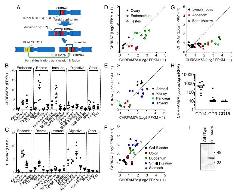 CHRFAM7A是由位于人类染色体15q13-14上的α7-N乙酰胆碱受体(α7 nicotinic acetylcholine receptor,α7nAChR/CHRNA7)基因。该基因在人类进化过程中通过基因重排形成的人类特异性基因,因此CHRFAM7A是一个与CHRNA7接近的杂交基因,编码一种与α7nAChR结构类似的蛋白质。两个基因都由独立的特异启动子调节表达。最近几项遗传学研究表明,CHRFAM7A/CHRNA7基因座和15号染色体上CHRFAM7A的2bp突变与尼古丁依赖、精神分裂症、认知功能障碍和神经退行性疾病有关。