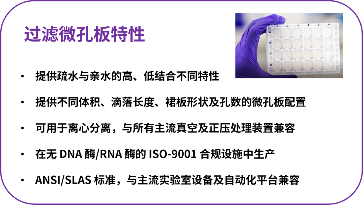 根据膜的结合力来说分为两类:一类是低结合的过滤微孔板(如:聚丙烯、聚醚砜),另一类是高结合的过滤微孔板(如:玻璃纤维)。这对于是收集滤液,还是将部分样品保留在膜上的不同应用非常重要。