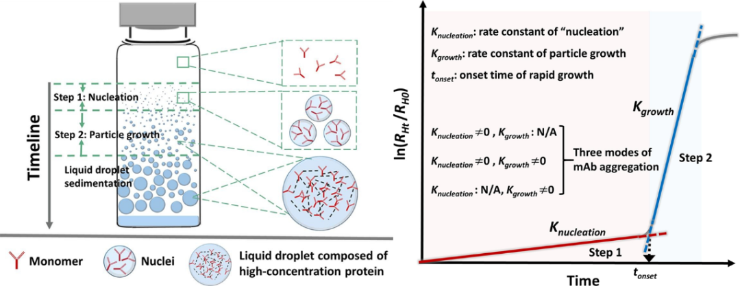 1从物理化学、胶体科学层面深度探究了影响单抗溶液相分离和聚集的关键结构因子和溶液理化因素。研究发现,单抗分子在相分离过程中以一级动力学规律聚集成核且不断长大并形成高浓度的单抗液滴,最终沉降形成明显的相分离状态。本研究从单抗聚集动力学角度定义了可量化的关键动力学参数,如成核速率(K