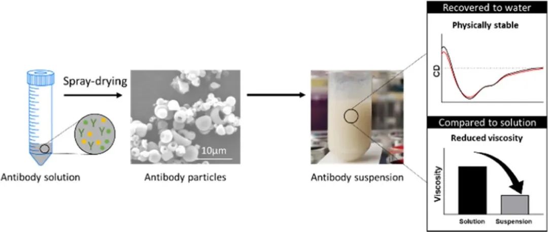 图三:单抗混悬液的技术实施路径:1,使用喷雾干燥技术制备稳定单抗固体颗粒;2,选取非水相有机溶剂混悬单抗颗粒获得高浓度、低黏度混悬液。