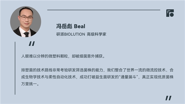 研派是定位于进阶功效的口服益生菌新兴品牌,其以普林斯顿、耶鲁等常春藤院校为背景的卓越自研团队(主要成员:黄松、滕欣、冯岳彪、张腾勋),依托柔性自动化平台,结合高通量微流控技术,于今年初成功获取能促进体内微塑料排出的益生菌菌株Droplastic™,并将在同年底实现产品应用生产及上市。