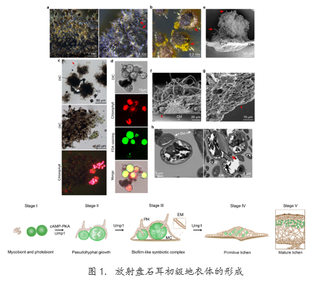 以石生地衣放射盘石耳为研究模型,对Ump1 MAP激酶在菌-藻互作和初级地衣体形成过程中的分子调控机制进行研究(图1)。研究团队摸索出有利于共生互作和地衣体分化的条件,证明了Ump1 MAP激酶在地衣发育中的重要性。研究发现,在硬性表面菌-藻最初形成类似生物膜状的共生复合体,藻细胞与覆盖有胞外基质的假菌丝交织在一起。在培养过程中控制水分和营养等条件后,菌-藻复合物的表面进一步分化成假薄壁组织,并对其中包裹的藻细胞提供物理保护。而UMP1缺失的突变体在假菌丝生长、生物膜状复合体的形成和初级地衣体的发育等方面有缺陷,在ump1突变体中也无法再观察到菌丝入侵藻分裂过程中的母细胞从而助力形成藻层的现象。